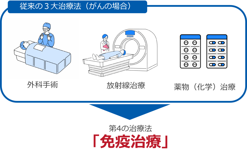 がんの場合、従来の治療方法は外科手術、放射線治療、薬物(化学)治療の3つの方法がありましたが、近年、第4の方法として「免疫治療」が登場し、従来の治療法では効果が得られなかった患者にも、新たな治療の選択肢を提供できるようになりました。