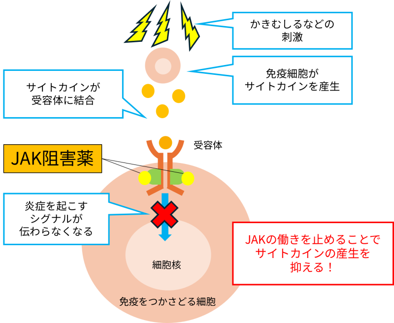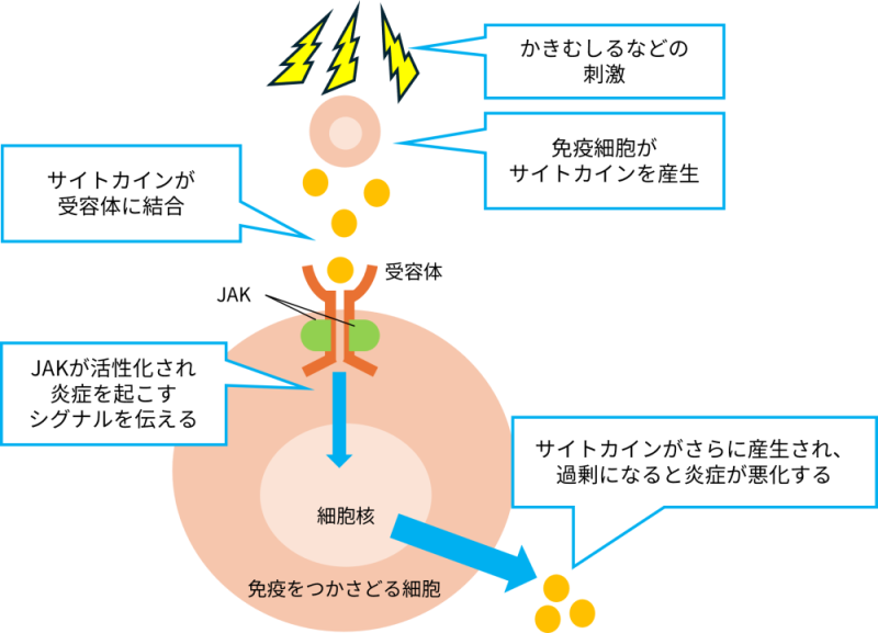 JAKは、サイトカイン受容体の細胞内側に結合しており、サイトカインが受容体と結合するとJAKが活性化し、細胞核にシグナルを送ります。細胞核はそのシグナルを受けて、免疫応答や炎症に関わるサイトカインなどのたんぱく質を作り始めます。しかし、これらのたんぱく質が過剰に作られると、強いかゆみと炎症の悪化を引き起こします。